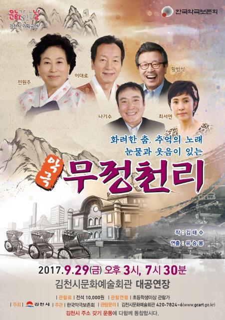 악극 <무정천리>는 6·25 전쟁과 보릿고개를 겪은 세대의 굴곡진 삶과 인생 이야기를 그린 작품으로 1950년 9월 서울 수복 당시 북한에 끌려 미아리 고개를 넘어 북으로 간 남편과 생이별 하게 된 돌산댁이 4남매와 함께 어렵게 살아가는 생활을 그린 작품으로 전원주, 이대로, 황범식 등 친숙한 중견배우들과 촉망받는 젊은 연기자 등 총 20여명이 출연하여 화려한 춤과 추억의 노래를 통해 완성도 높은 무대를 선보일 예정이다. 장귀희 관장은 “6.25전쟁이라는 아픔의 역사를 다룬 공연으로 전 세대가 공감할 수 있는 시간이 될 것이고 관객들에게 웃음과 눈물, 진한 향수를 선사할 것으로 기대한다며 많은 시민들께서 참석하셔서 함께 즐길 수 있는 기회가 되길 바란다”고 전했다.