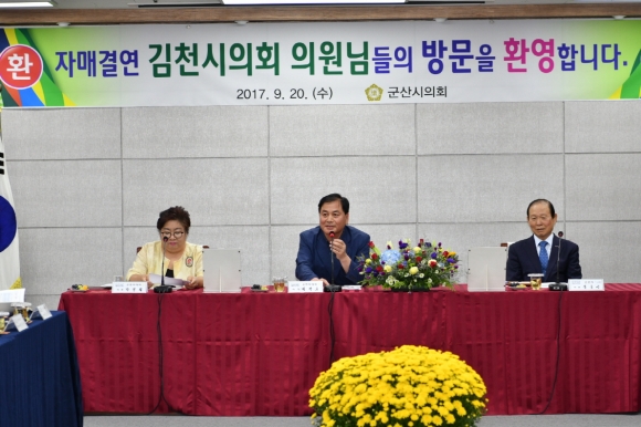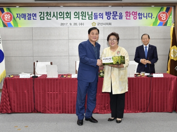 박정희 군산시의회 의장은“먼 길을 마다않고 와주셔서 정말 감사드리며 두 의회가 손을 맞잡고 좋은 정보와 지혜를 교환하여 나날이 발전하고 형제애를 나눌 수 있는 김천과 군산이 되도록 가교 역할을 하자”라고 했다.