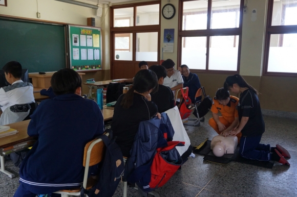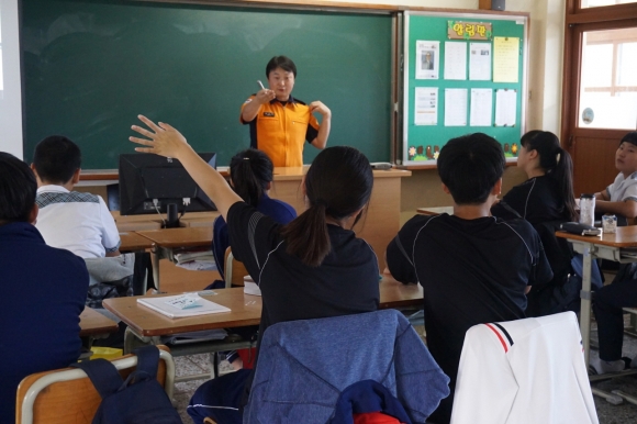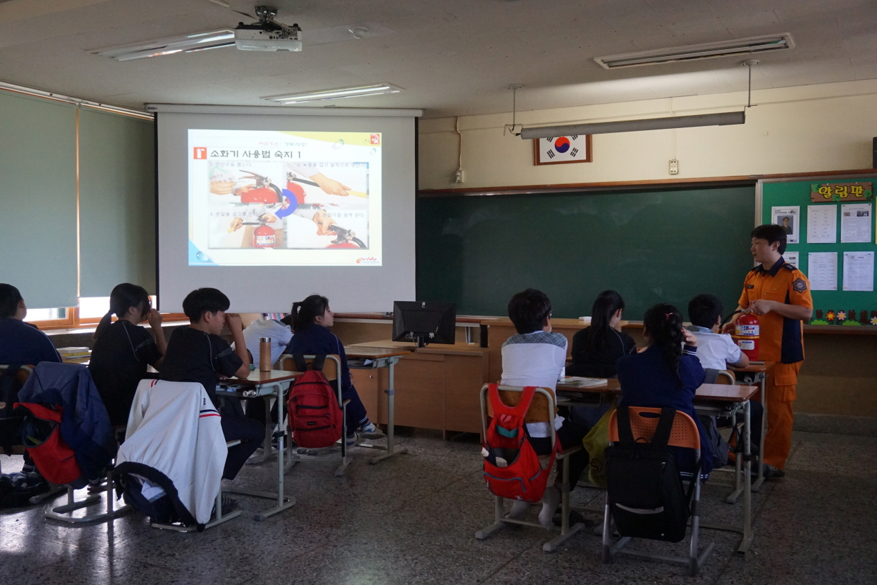 | 어모중학교(교장 서영교)는 2017년 9월 20일(수) 자유학기제 진로탐색 프로그램의 하나인 ‘미래소방관 체험교실’을 1학년 9명을 대상으로 실시하였다. 미래소방관 체험교실은 학생들로부터 “가장 신뢰받는 직업”,“생명을 구하는 직업” 소방관의 화재진압, 인명구조, 응급처치 등의 진로탐색과 직업체험을 통해 학생 스스로 안전을 배우고 익히며, 나아가 타인의 안전을 존중하고 배려할 수 있는 미래 소방관 육성을 위한 프로그램의 하나로 운영되고 있다.