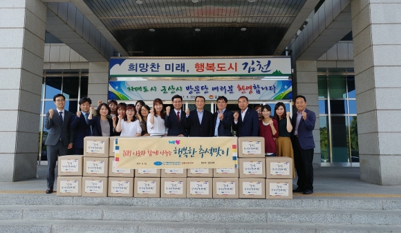 | 국제위러브유운동본부 김천지부(지부장 박진우)는 2017년 9월 22일(금) 김천시청을 방문하여 100만원 상당의 식료품 세트를 전달했다.