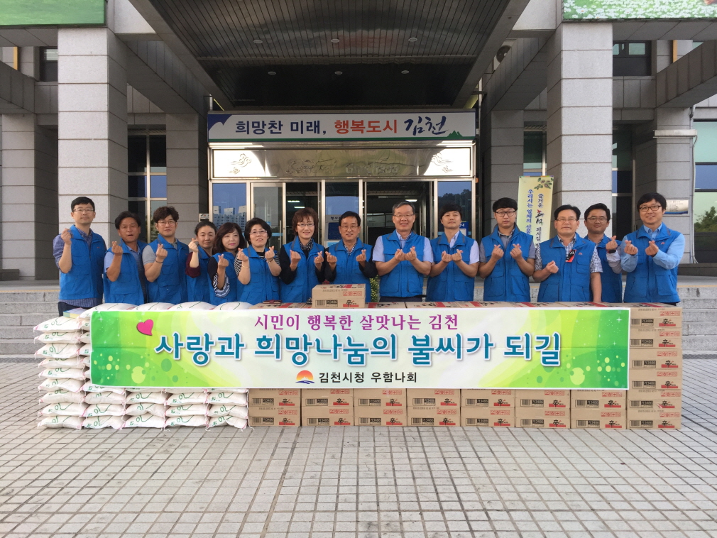 김천시청 공무원 60여명으로 구성된 우함나회는 우리함께 나눔이란 뜻으로 월 1만원의 기부금으로 명절마다 위문품을 전달하고 어려운 이웃이 있다면 연탄배달, 복지장학금 지급, 가전제품 놔드리기 운동 등 작은 사랑 실천을 이어가고 있는 봉사동아리다.