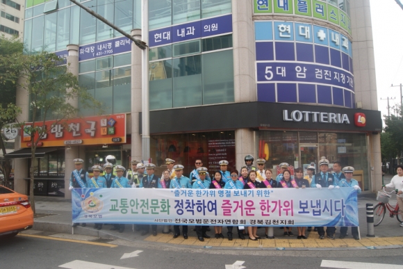 | 김천경찰서(서장 김영수)에서는 9월 26일(화), 이마트사거리에서 유관단체와 함께 교통사고예방을 위한 캠페인을 실시하였다.