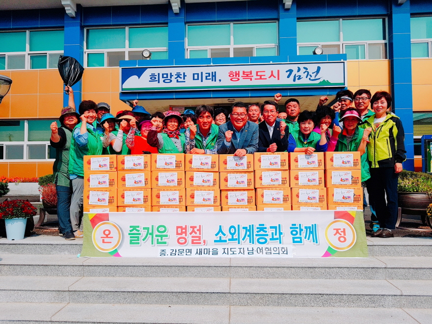 | 감문면 새마을지도자 협의회(회장 정성환, 부녀회장 신양자)는 경로효친사상을 고취하고, 이웃사랑의 의미를 실천하고자 국수(3kg) 40박스(시가 일백만원)를 구입하여 32개소 마을 경로당에 직접 전달하는 국수나눔행사를 진행하였다.