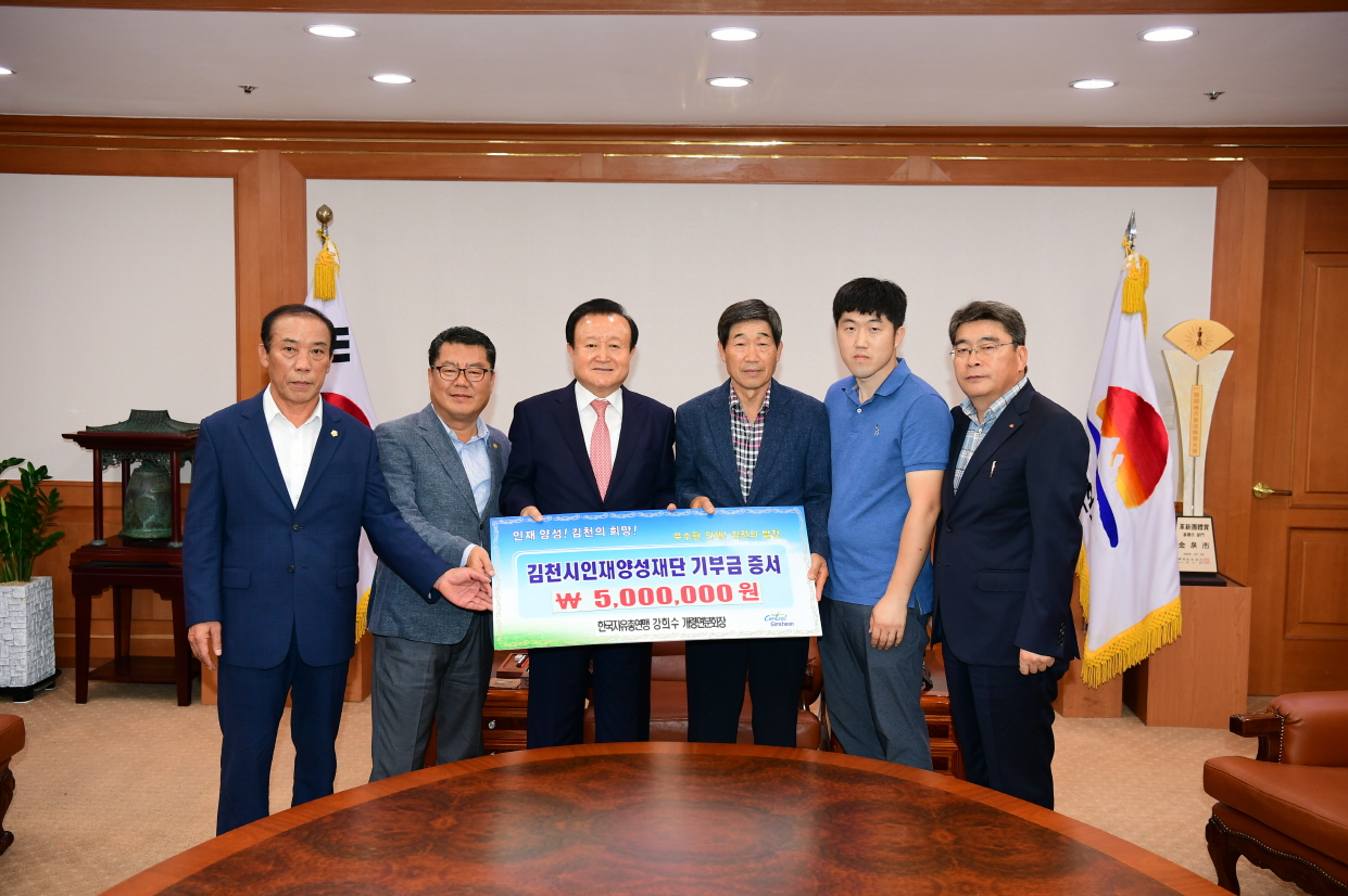 지난 9월 25일 2층 접견실에서 서부목장 강희수 대표(한국자유총연맹 개령면분회장)와 아들 강동구씨는“지역의 우수한 인재육성에 조금이나마 보탬이 되고자 장학기금 오백만원을 김천시인재양성재단에 기탁하게 됐다”고 말했다.