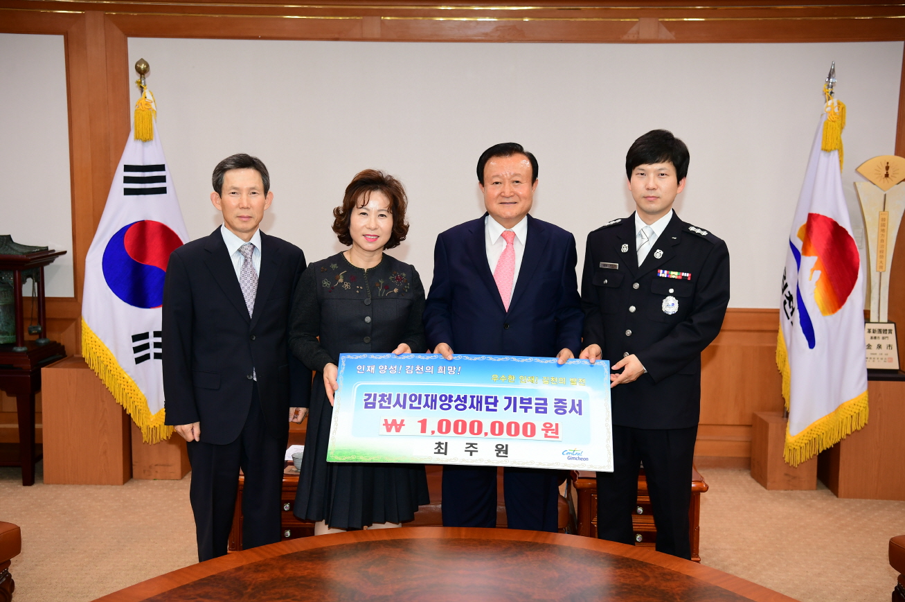 지난 9월 21일 2층 접견실에서 최주원과 전)아포농협 전무와 배우자 전명자씨, 소방청에 근무하는 아들 최지현군은 “지역의 인재 육성을 위한 장학사업에 조금이나마 도움이 되고자 가족들이 마음을 모아 장학기금 일백만원을 김천시인재양성재단에 기탁하게 됐다”고 말했다.