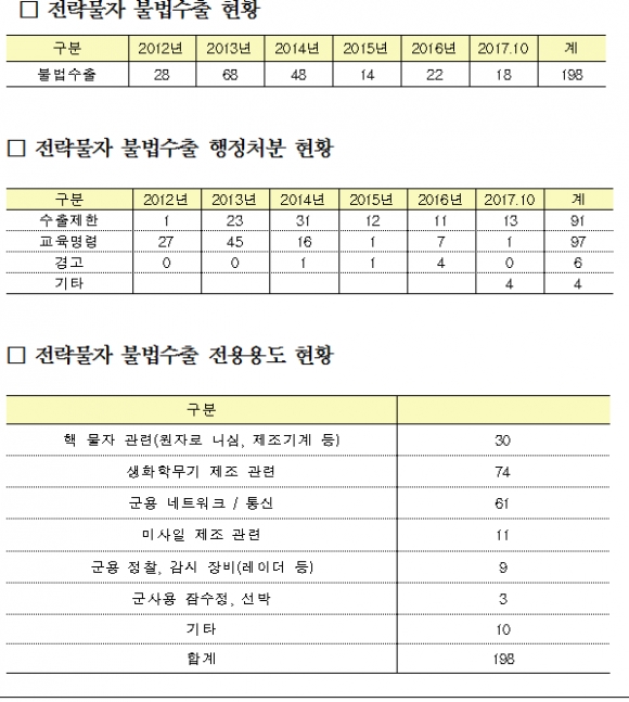 국회 산업통상자원중소벤처기업위원회 소속 이철우 의원이 산업통상자원부와 전략물자관리원에 ‘전략물자 불법수출 현황’ 자료를 요구한 결과 2012년부터 2017년 9월까지 핵무기 제조관련 물자는 30건이 불법수출됐으며, 대량살상용 생․화학무기 재료 74건, 국내 사이버안보관련 네트워크 장비 61건 등 국가안보에 중요한 전략물자 198건이 해외로 불법수출된 것으로 나타났다.