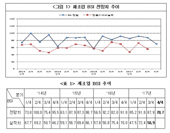 4분기 기업경기전망 지수가 여전히 기준치 100에 미치지 못하는 70.7를 나타내 하반기에도 기업들이 느끼는 체감경기가 나빠질 것이라는 전망을 나타내고 있다.