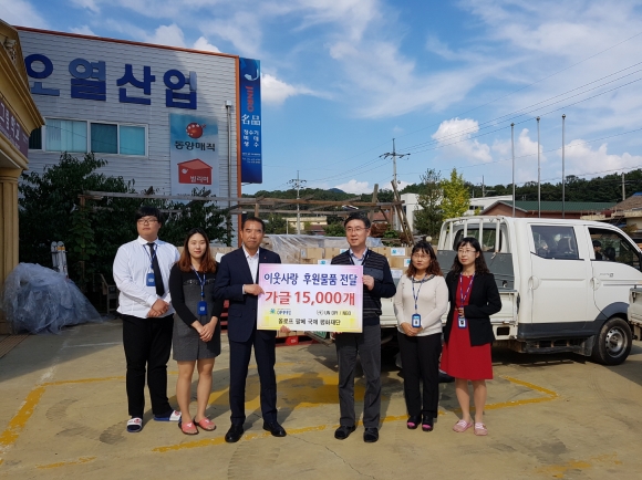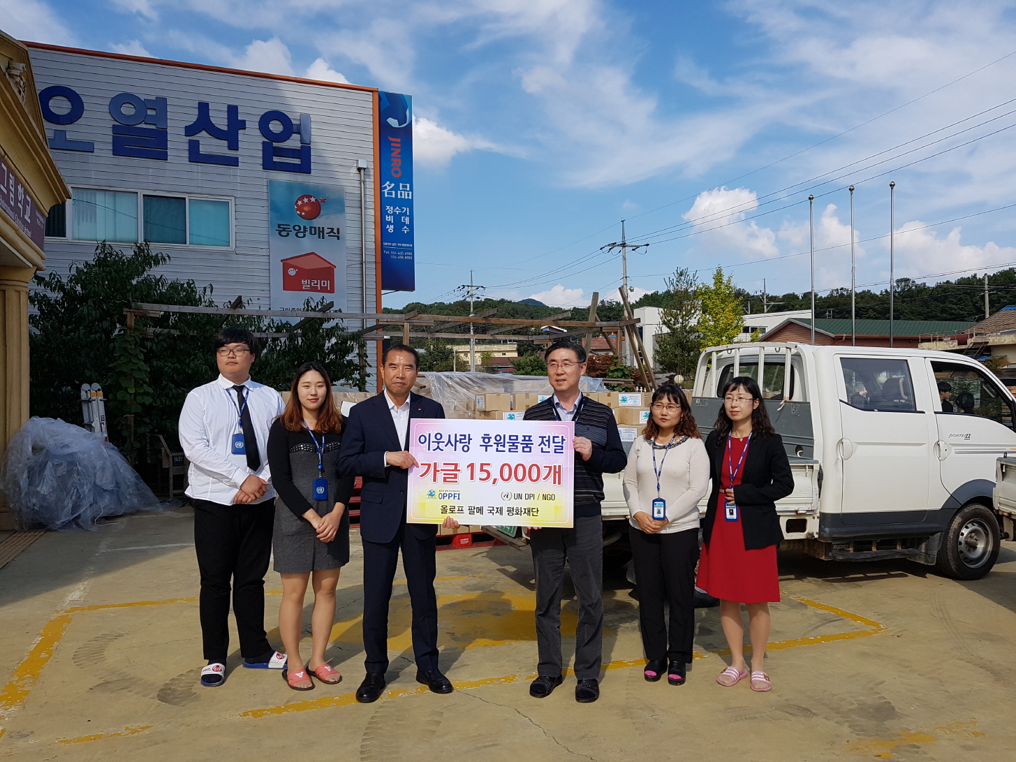 | 올로프 팔메 국제평화재단(아시아대표 강경구)은 2017년 10월 17일(화) 관내 소외이웃들의 구강건강을 위해 15,000개의 가글을 김천시에 기탁했다.