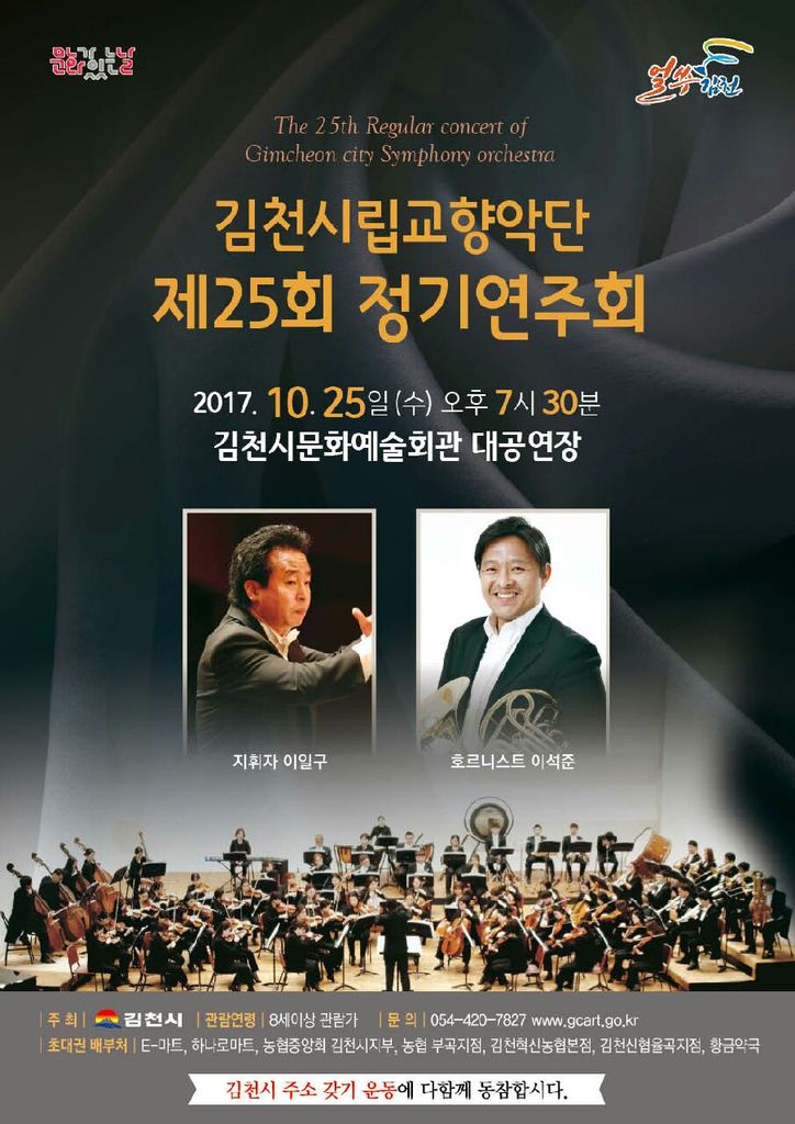 김천시문화예술회관(관장 장귀희)에서는 10월 25일(수) 오후 7시 30분 대공연장에서『시립교향악단 제25회 정기연주회』를 개최한다. 이번 공연은 이일구 지휘자님의 해설과 더불어 호른협연이 함께하는 무대이다.