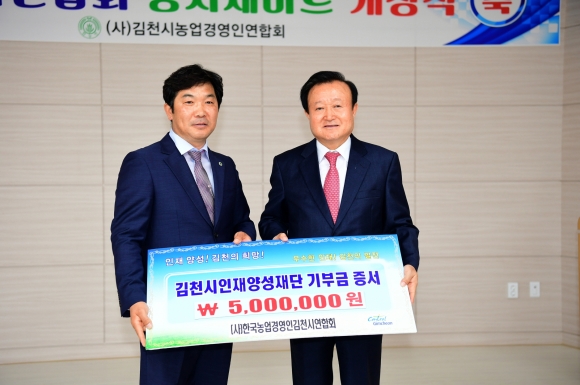 지난 16일 한농연김천시연합회 농자재마트 개장식 행사장에서 (사)한국농업경영인김천시연합회 육광수 회장과 임원진들은 “지역의 우수한 인재육성과 교육발전에 적극 동참하고자 회원들이 마음을 모아 장학기금 오백만원을 김천시인재양성재단에 기탁하게 됐다”고 말했다.