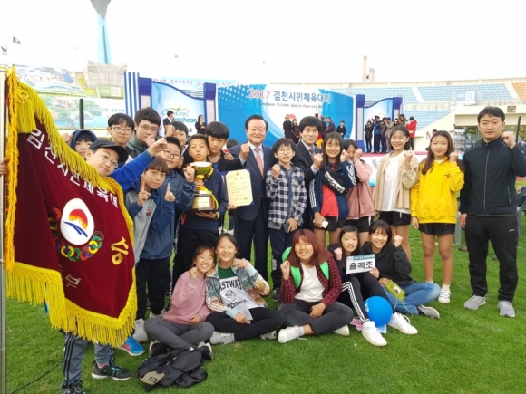 | 율곡초등학교(교장 이삼영)은 지난 10월 13일(금) 김천종합운동장 주경기장에서 열린 ‘2017 김천시민체육대회’에서 초등부(시부) 우승을 거두었다.