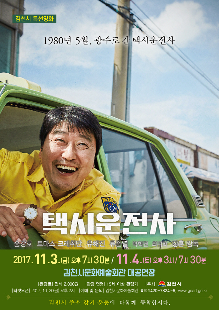 김천시문화예술회관(관장 장귀희)에서는 시민들의 건전한 여가문화 활성화를 위하여 특선영화 <택시운전사>를 11월 3일(금) 오후 7시 30분, 11. 4(토) 오후 3시, 오후 7시 30분 3회에 걸쳐 김천시문화예술회관 대공연장에서 상영한다.