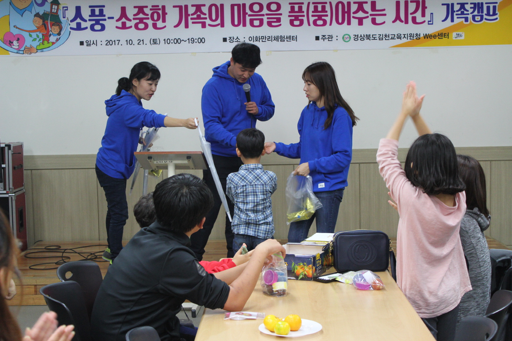 | 경상북도 김천교육지원청(교육장 신정숙) Wee센터는 자두꽃 향기가 만리까지 퍼진다는 아름다운 농촌 마을인 ‘이화만리체험센터’에서 부모-자녀간의 갈등으로 관계 회복을 원하는 가족들과 함께『소풍-소중한 가족의 마음을 품(풍)어주는 시간』가족캠프를 운영해 큰 호응을 얻었다.