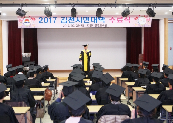 | 김천시는 10월 26일(목) 평생교육원 3층 강당에서 박보생 시장, 수료생, 내빈 등 100여명이 참석한 가운데 2017 김천시민대학 수료식을 개최했다.