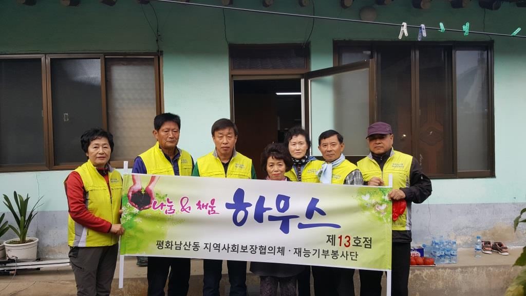 | 2017년 10월 28일(토) 김천시 평화남산동 지역사회보장협의체(위원장 허은)와 재능기부봉사단은 주거환경이 열악한 독거노인 1가구와 기초수급자 1가구를 방문하여 주거환경개선사업을 시행하였다. 평화남산동 지역사회보장협의체 및 재능기부봉사단은 쾌적한 주거환경을 제공하여 주민들로부터 좋은 호응을 얻고 있으며, 신청가구가 증가함에 따라 사전 방문조사를 하여 필요한 곳에 사랑 나눔 실천을 하고 있다.