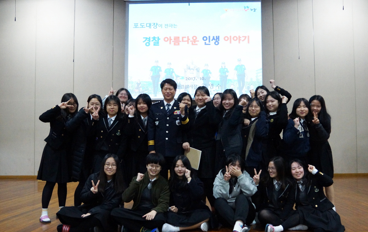 | 김천경찰서(서장 김영수)에서는 10월 30일 김천 성의여고 전교생 423명 ․김천여고 전교생 527명을 대상, ‘포도대장이 전하는 아름다운 경찰인생’이라는 주제로 경찰서장 특강을 진행하였다.
