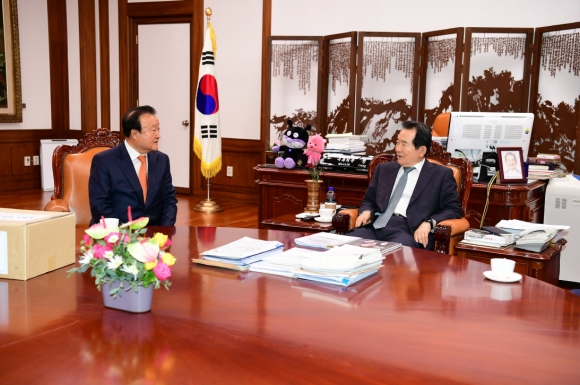 | 10월 30일 박보생 김천시장, 김정호 김천상공회의소 회장, 하진수 한국전력기술 노조위원장은 국회를 방문하여 정부의 에너지 전환 정책에 따른 ‘한국전력기술(주) 경영 위기 극복, 김천혁신도시 활성화’를 위한 범시민 서명록을 전달하였다.