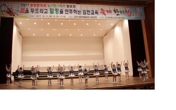 | 김천교육지원청(교육장 신정숙)은 2017년 10월 31일(화) 김천시문화예술회관에서 2017년 화랑문화제 및 1인1악기 발표회를 개최하였다. 학교별 교내대회와 각종 대회에서 수상한 문예작품과 미술작품 70여 점이 전시되었고, 각 학교를 대표하는 24개의 공연 팀이 음악과 무용 공연을 선보이며 그동안 갈고 닦은 기량을 마음껏 발휘하였다.