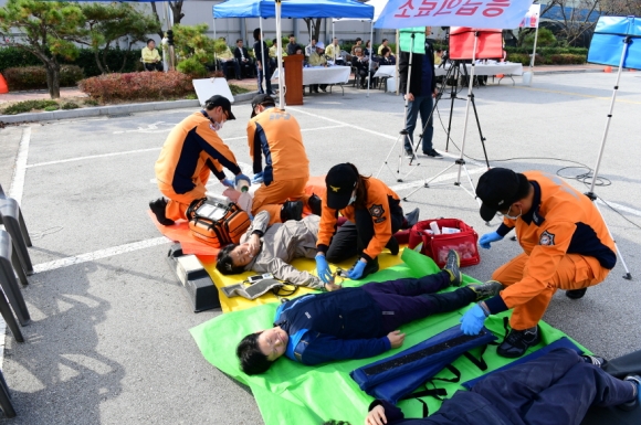 이날 행사는 김천소방서, 김천경찰서, 제5837부대 3대대, KT, 한전, 전기안전공사 등 유관기관과 의용소방대, 자율방재단, 건축사협회 등 관련단체회원 100여명이 참석한 가운데 각자의 역할에 맞는 임무를 숙지하는 훈련을 했다.