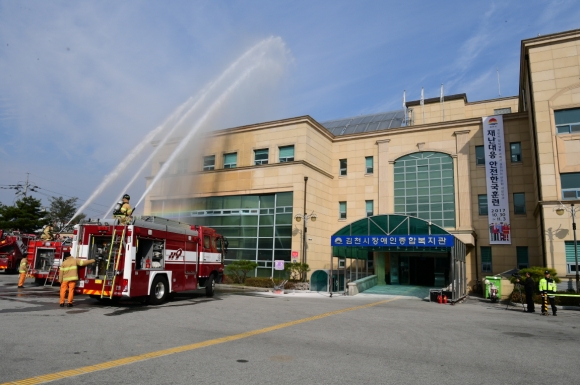 | 김천시(시장 박보생)는 11월 2일 김천장애인종합복지관에서 대형화재가 발생했을 때 신속히 출동하여 인명과 재산피해를 최소화하기 위한 재난대응 안전한국훈련 현장훈련을 실시했다.