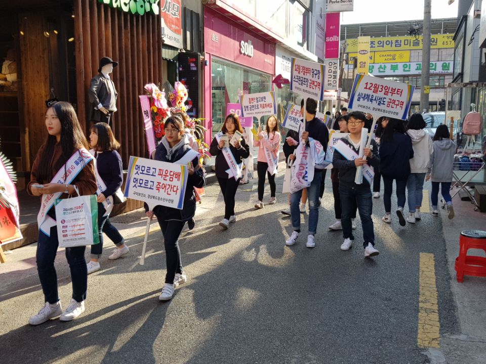 | 이날 캠페인은 구미역 광장, 구미 중앙시장 등 유동인구 밀집지역을 중심으로 흡연의 폐해 홍보물 배부, 가두캠페인 등으로 전개되었으며, 또한 구미시보건소와 함께 금연 상담 부스를 마련해 금연관 련 상담, 금연보조제의 올바른 사용법 등 금연클리닉도 이어져 청소년들과 지역민들에게 큰 호응을 얻었다.