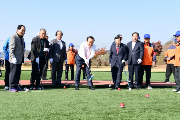 | 한편, 게이트볼 경기는 13세기경 프랑스에서 시작되어 미국, 영국, 일본을 거쳐 우리나라에 보급된 운동으로 지금은 어르신들이 즐기는 대표적인 운동으로 자리매김하고 있다. 한 팀당 5명씩 2팀의 대항전 형식으로 진행하며 스틱을 이용해 볼을 치되 3개의 게이트를 차례로 통과한 후 골폴에 공을 맞히면 2점을 획득하며 경기가 종료되는 운동이다. |