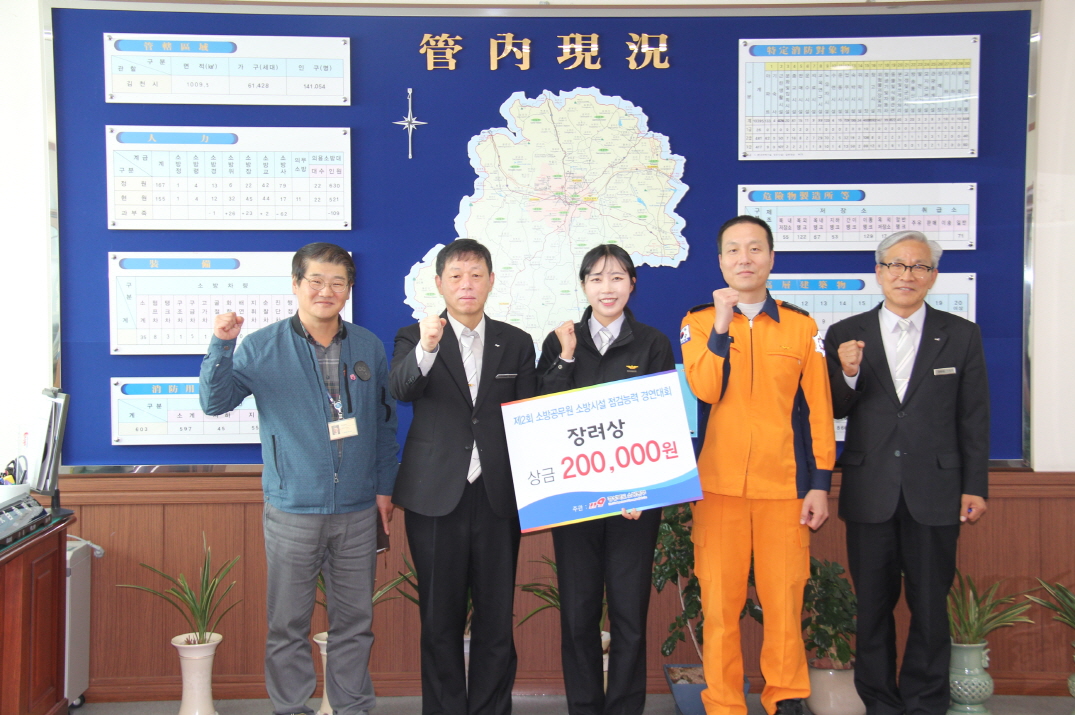 | 김천소방서(서장 백남명)는 11월 6일 경북소방학교에서 소방공무원의 소방시설 점검능력 향상을 위한「제2회 소방시설 점검능력 경연대회」에서 김천소방서 소방장 엄창신, 소방사 이주희 팀이 장려상을 수상하였다.