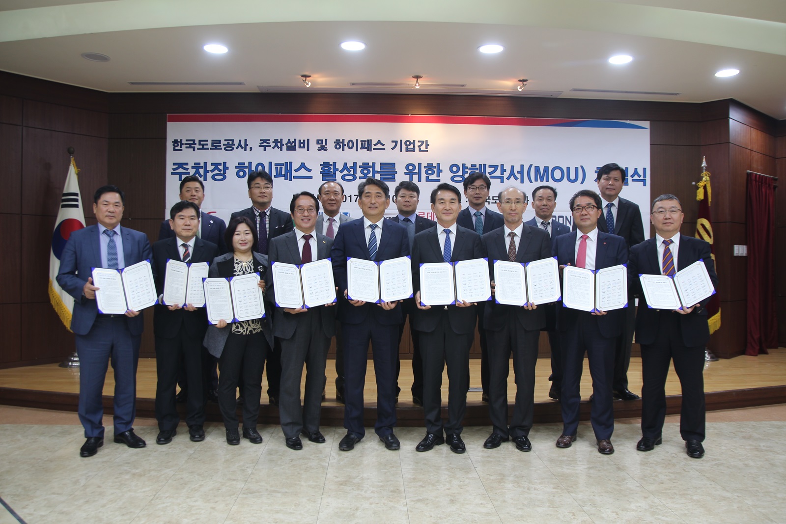 한국도로공사(사장 직무대행 신재상)는 10일, 민간업체 14곳과‘주차장 하이패스 개발 및 마케팅 상호협력’에 관한 업무협약을 체결했다고 밝혔다. 이번 협약에는 국내 하이패스 단말기 제조 7개사, 주차설비 제조 7개사가 참여했다.