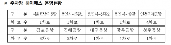 한편, 현재 주차장 하이패스는 경부선 만남의 광장 장기 주차장을 비롯하여 용인시, 인천국제공항공사, 한국공항공사에서 운영하는 주차장에 설치되어 운영 되고 있다.