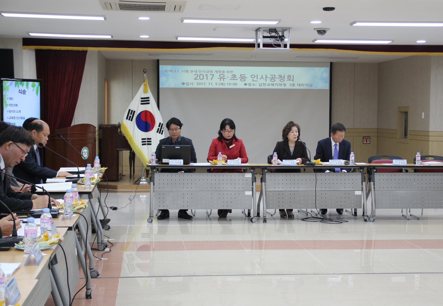 | 경상북도김천교육지원청(교육장 신정숙)은 11월 9일(목) 오후 3시 김천교육지원청 대회의실에서 ‘2017 유·초등 인사공청회’를 개최하였다. 이번 공청회에서는 관내 유·초등 급지별, 교원별 대표 교원 26명이 참석하였다.