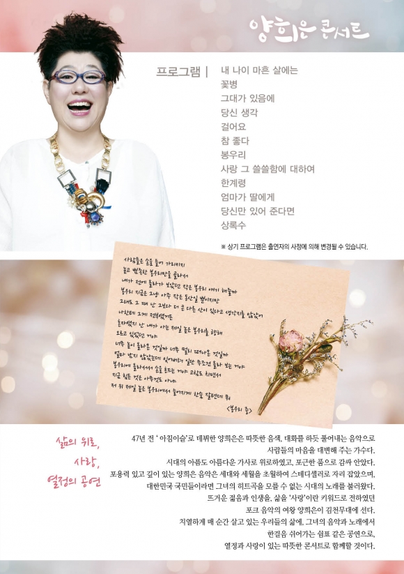 | 이번 공연에는 47년 전 ‘아침이슬’로 데뷔하고 따뜻한 음색, 대화를 하듯 풀어내는 음악으로 사람들의 마음을 대변해 주는 가수 양희은을 초청하였다. 양희은은 ‘행복의 나라로’, ‘상록수’, ‘사랑 그 쓸쓸함에 대하여’ 등 모든 세대를 아우르는 이야기가 담긴 따뜻한 음악으로 관객들에게 진한 감동을 선사할 예정이다. 장귀희 관장은 “매 순간 치열하게 살고 있는 우리들의 삶에 한걸음 쉬어가는 쉼표 같은 공연을 준비하였으니, 많은 시민들께서 참석하시어 열정과 사랑이 있는 따뜻한 콘서트를 관람하시길 바란다”고 전했다.