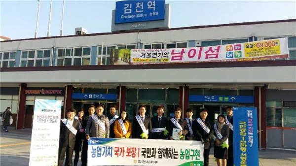 |  | | | ⓒ 김천내일신문 | | 농협김천시지부(지부장 김한주)은 농업의 공익적 가치를 헌법에 반영하기 위한 국민공감 운동을 확산하기 위해 지난 1일부터 농업가치 헌법 반영을 위한 범농협 서명운동을 전개한다고 밝히면서, 11월10일 “범농협 전국 동시 가두 캠페인”을 전개 하였다