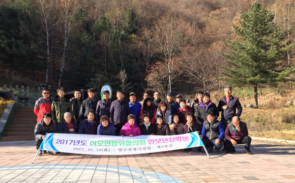|  | | | ⓒ 김천내일신문 | | 김천시 어모면 방위협의회(회장 편재관)에서는 11월 14일 강원 양구로 안보현장 답사를 다녀왔다. 이 날 이른 아침부터 모인 방위협의회 회원들은 안보 체험을 위해 양구 제4땅굴과 전쟁기념관, 을지전망대를 관람하며 북한의 여러 도발로부터 대한민국을 굳건히 지켜낸 호국현장의 생생한 기운을 다시 한번 느낄수 있는 뜻깊은 시간을 가졌다. 이정하 어모면장은 “최근 북한의 미사일 발사, 북핵 위협 등으로 국가안보가 어느 때보다 중요한 시기에 오늘의 안보 현장 답사를 통해 방위협의회 회원들이 단합하고 안보태세를 더욱 강하게 갖출 수 있는 계기가 되기를 바란다.”고 말했다.