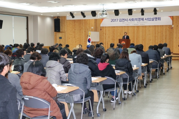 | 김천시(시장 박보생)는 지난 11월 17일 오후 3시 근로자종합복지관 3층 강당에서 사회적경제 관계자 및 시민 170여명이 참석한 가운데 사회적경제에 대한 올바른 이해와 가치 공유를 통한 지역의 역량있는 사회적경제 기업가를 발굴‧육성하기 위한 「2017 사회적경제 사업설명회」를 개최하였다.