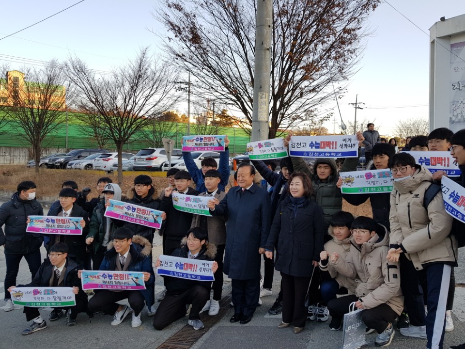| 김천교육지원청 신정숙교육장은 “이러한 응원에 힘입어 수험생들이 그동안 갈고 닦은 실력들을 유감없이 발휘함으로써 올해 김천 지역에서 수능 대박이 있을 것”이라며 수험생들을 격려하였다. |