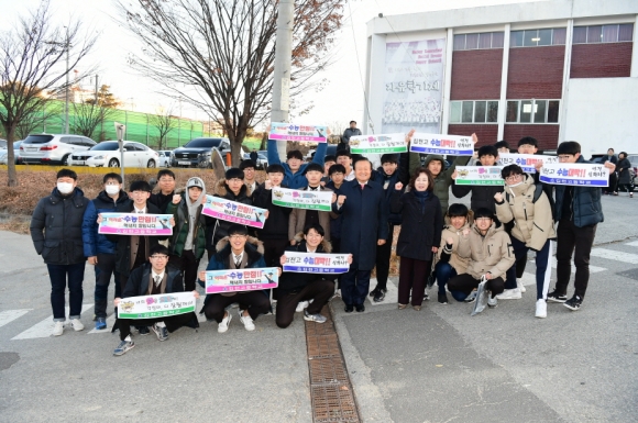 각 시험장 입구에는 이른 새벽부터 선배들의 수능 대박을 기원하는 후배들이 다양한 문구와 응원 도구로 열띤 응원전을 펼쳤으며, “아버지! 날보고 있다면 정답을~”, “재수는 없다~ 잘 풀고 잘 찍자”, “너의 꿈을 응원해! 걱정마, 다 잘될꺼야”, “그 어려운 수능대박 해내지 말입니다.”, “선배님들,~ 수능대박! 기원합니다.”등 다양하고 익살스러운 문구를 새겨 넣은 피켓과 현수막을 들고 응원하는 학교 후배들의 힘찬 응원과 함성은 수험생과 학부모들의 긴장된 마음에 따뜻한 위안을 안겨주었다.