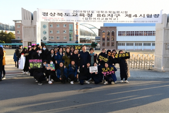 이날, 각 시험고사장 입구에는 김천시청 자치행정과, 새마을문화관광과, 사회복지과, 평생교육원 직원들과 바르게살기운동 김천시협의회, 김천사랑 주부봉사단, 14개 여성단체로 구성된 김천시 여성단체협의회, 양금동 지역봉사단체 황금문 등에서 따뜻한 차와 초콜릿 등을 수험생과 학부모들에게 나눠주면서 격려하였다.