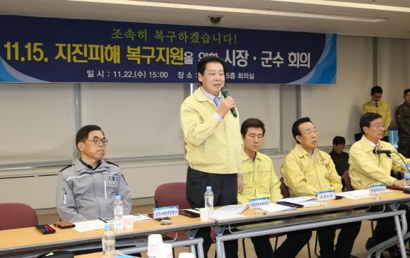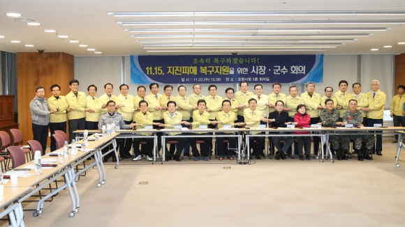 이번 회의는 지난 11월 20일(월) 정부의 특별재난지역 선포 의결 이후 곧바로 소집돼 도내 23개 시군의 가용 가능한 인적, 물적자원을 총동원해 포항시장 지휘아래 신속히 지원하여 최대한 빠른 시일 내에 포항시민들이 일상으로 돌아갈 수 있도록 돕자는 취지에서 마련되었다. 시장․군수들은 포항시 부시장의 지진 피해현황과 대처상황, 경상북도 현장 행정지원단장의 협조요청 사항을 보고받고 시군으로 돌아가는 즉시 유관기관, 지역주민들과 연계해 포항지역 피해복구에 전력을 다해 지원하기로 의견을 모았다.