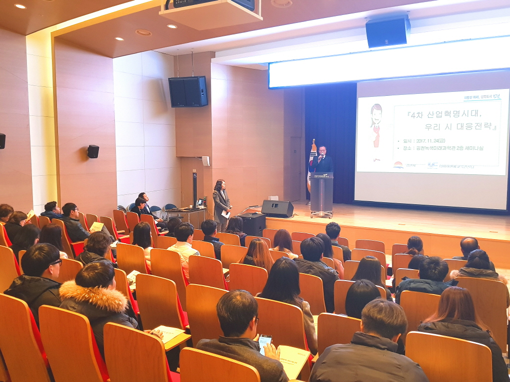 | 김천시는 11월 24일 김천녹색미래과학관 세미나실에서 시청 및 읍면동 직원 200여명이 참석한 가운데,‘4차 산업혁명 시대, 우리는 무엇을 할 것인가?’이라는 주제로 특강을 실시했다.