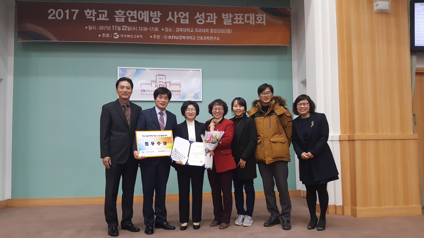 | 율곡초등학교(교장 이삼영)는 지난 11월22일(수) 2017년 경북대학교 의학전문대학원에서 개최된 학교 흡연예방사업 성과 발표대회에서 최우수교로 선정되었다. 학교흡연예방사업 성과 발표대회에 선발된 학교는 김천신일초, 율곡초, 중모초, 동명동부초, 울릉중, 금오고, 순심여자고 등이 참석하여 최우수 3개교, 우수 2개교, 장려 2개교가 정해졌다.