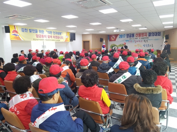 | 양금동주민센터(동장 최병준)에서는 11월 24일 통장, 기관·단체장, 시의원, 새마을 지도자·부녀회장 등 100여명이 참석한 가운데 2017년 산불방지 결의대회를 개최 하였다.