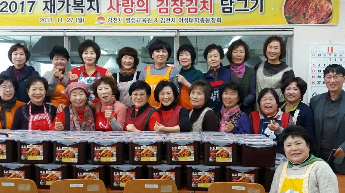 | 김천시 평생교육원(원장 김금숙)에서는 11월 27일(월) 김장김치 210포기를 담가 관내 독거노인, 장애인 등 재가요보호대상자 65세대에게 전달하는 “사랑의 김장김치 담그기” 행사를 가졌다.