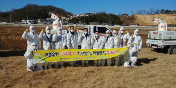 이날 행사는 김한주 농협김천시지부장, 임영식 김천축산농협 조합장을 비롯한 공동방제요원 등 20여명이 참석한 가운데, 차단방역 강화 조치를 위한 철새도래지·저수지·하천인근 등에서 소독시연을 실시함으로써, 차단방역 의식을 고취하고 불철주야 방역에 수고하는 현장 담당자들을 격려하기 위하여 실시 하였다.