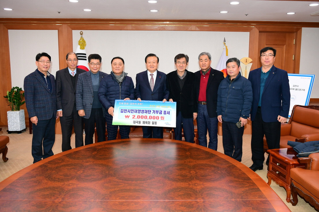 지난 12월 4일 2층 접견실에서 대곡동 체육회 김종철 회장과 임원진들은“지역의 우수한 인재육성과 교육발전에 적극 동참하고자 회원들이 마음을 모아 장학기금 이백만원을 김천시인재양성재단에 기탁하게 됐다”고 말했다.