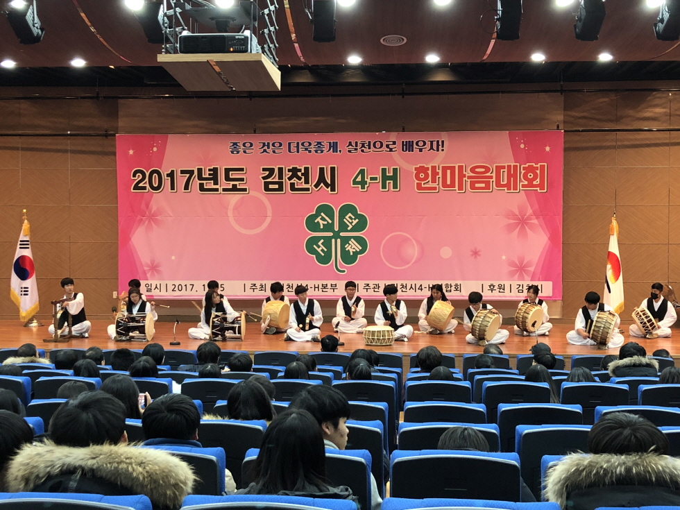| 김천시4-H본부(회장 지용석)와 김천시 4-H연합회(회장 정현기)는 12월 5일 농업기술센터 교육관에서 4-H회원, 4-H본부 지도자 및 지도교사, 관계자 180여명이 한자리에 모인 가운데 2017년『김천시 4-H 한마음대회』를 개최하였다.