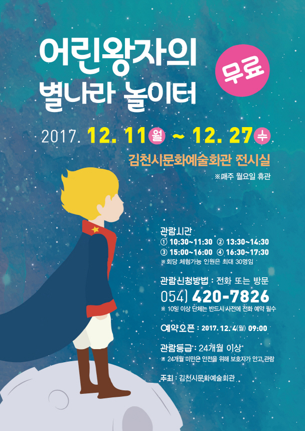 김천시 문화예술회관(관장 장귀희)에서는 오는 12월 11일부터 12월 27일까지 17일간 어린왕자를 꿈꾸는‘아이들의 별나라 놀이터 체험전’을 문화예술회관 전시실에서 개최한다.