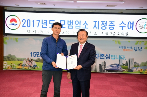 박보생 김천시장은 “김천시를 대표하는 모범음식점으로써의 자부심을 가지고 항상 청결한 위생과 친절한 서비스, 맛에 신경써주기를 바란다.”고 당부하였다.