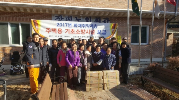 | 김천소방서(서장 백남명)는 지난 12월 8일 한국소방안전협회 대구경북지부와 연계하여 화재취약지역인 증산면 평촌리 외 3개 마을 화재취약계층에 대하여 주택용 소방시설(단독경보형감지기)을 무상 보급했다.