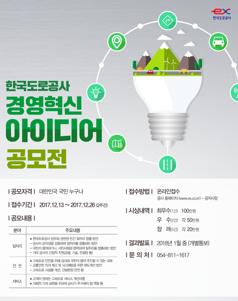 한국도로공사(사장 이강래)는 국민의 의견을 공사 정책에 반영하기 위해 12월 13일부터 ‘경영혁신 아이디어’를 공모한다고 밝혔다.