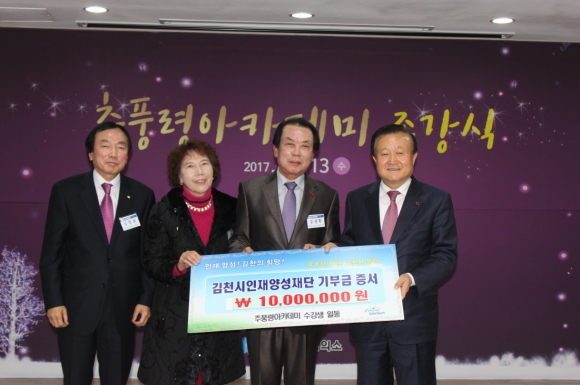 | 특히, 수강생들은 지역 교육 발전과 인재 육성에 동참하기 위해 십시일반 뜻을 모아 수강생들의 회비 중 일부와 김정호 김천상공회의소 회장의 기금을 합하여 일천만원을 김천시인재양성재단 장학기금으로 전달했다.